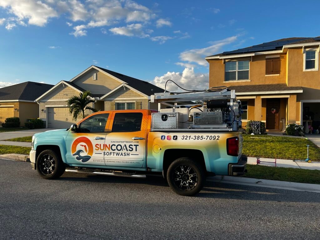 Suncoast Softwash provides professional roof cleaning, house washing, paver sealing, driveway and sidewalk cleaning, pool enclosure cleaning, and gutter cleaning across Brevard and Volusia counties.